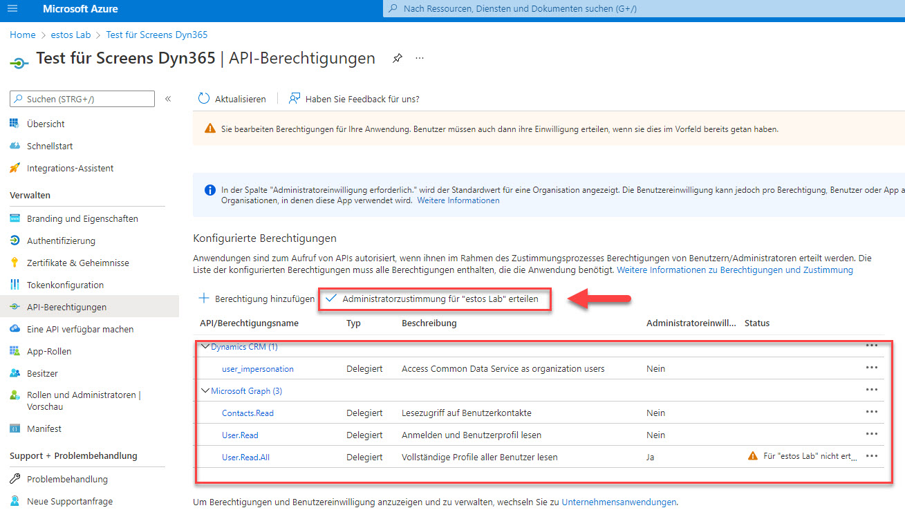 Danach müssen die delegierten Berechtigungen noch via "Administratorzustimmung" erteilt werden.