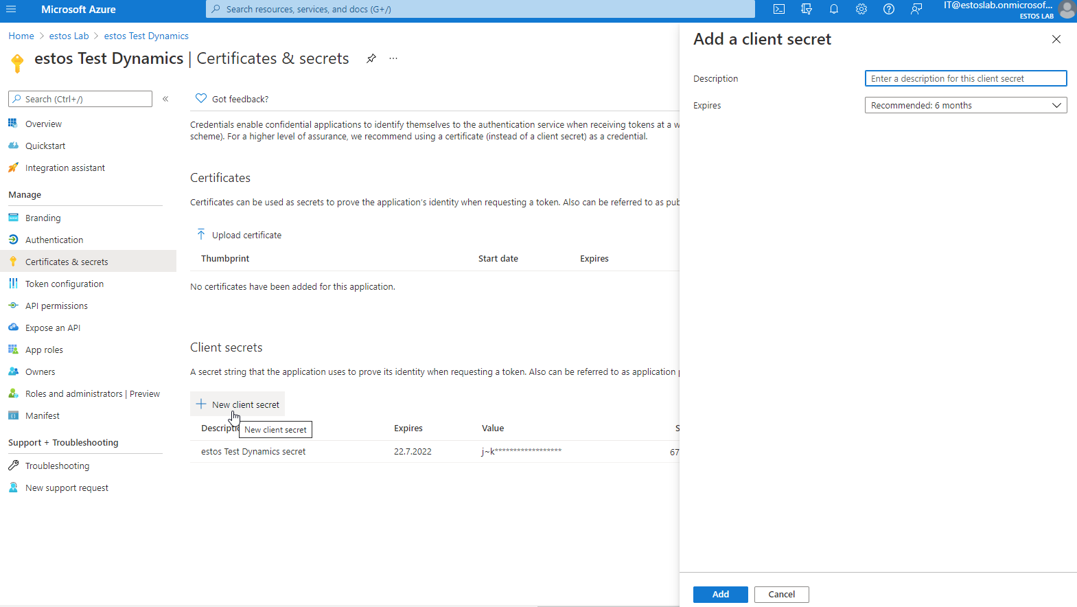 Fügen Sie unter Certificates & secrets ein neues client secret hinzu.