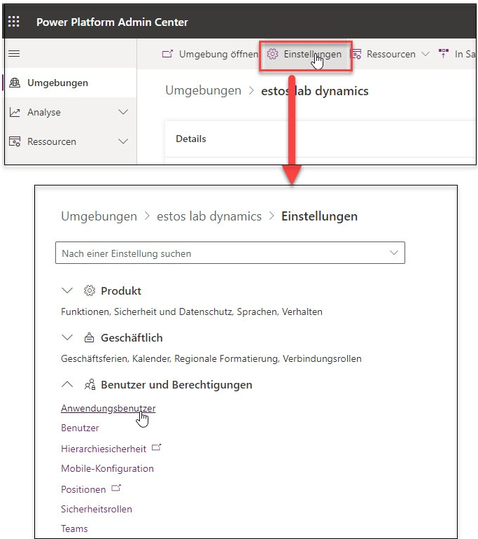 Beispiel Screenshot: Power Platform Admin Center - Umgebungen - Einstellungen - Anwendungsbenutzer