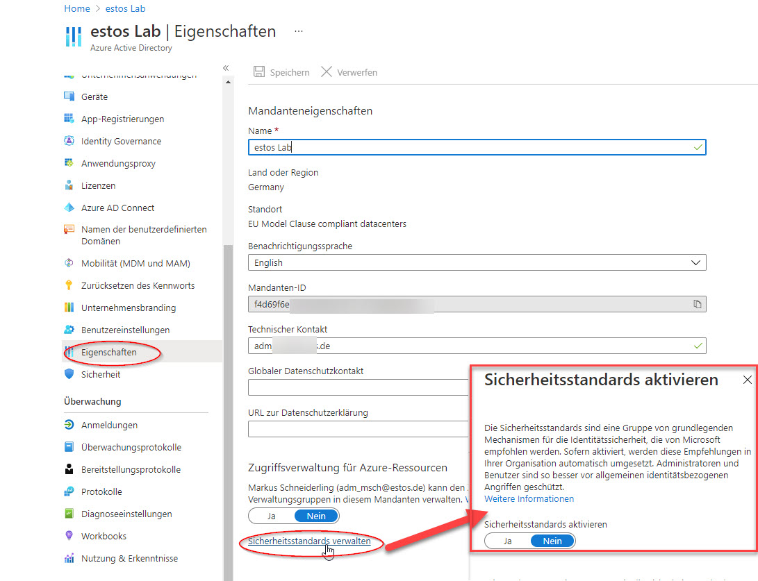 Beispiel Screenshot: Azure Active Directory Eigenschaften - Sicherheitsstandards verwalten