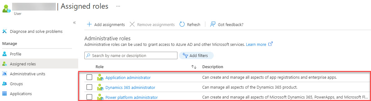 Beispiel Screenshot: User - Assigned roles - Administrative roles