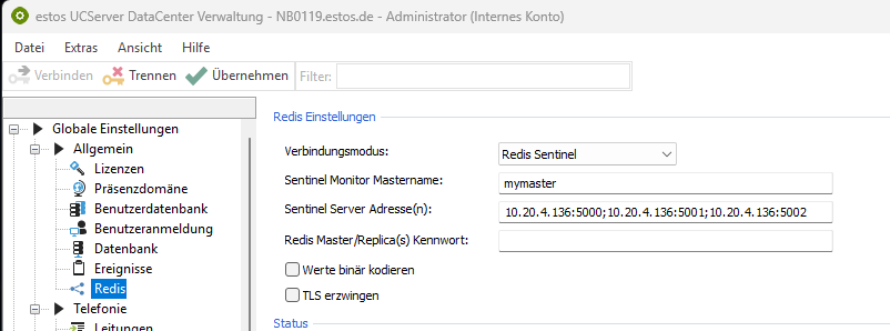 Es ist dennoch sehr zu empfehlen, die Verbindung zu dem installierten Redis Sentinel System zunächst auf einem UCServer zu verproben, der nicht in der Produktivumgebung läuft.