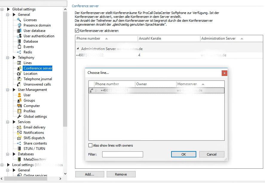 Bitte achten Sie darauf, dem Konferenzserver ausschließlich Leitungen zuzuweisen, die keinem Besitzer zugeordnet sind.