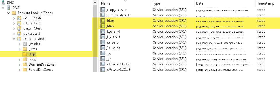 • Der DNS-Server muss hierzu eine entsprechende gleichnamige Zone kennen, unter der die markierten SRV-Records hinterlegt sind. Des Weiteren müssen auch die für die SRV-Records eingetragenen Server in IP-Adressen auflösbar sein. Die Zone kann eine Primary Zone, eine Secondary Zone oder eine Stub Zone sein.