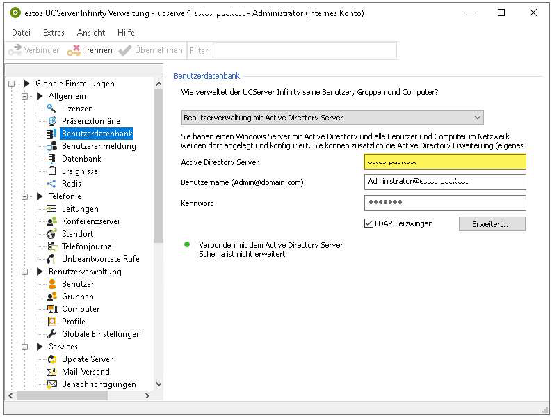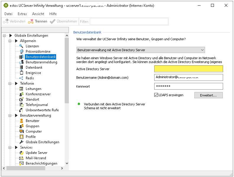 Ab Version 8.8.3 wurden die Möglichkeiten erweitert, UCServer an einen Microsoft Active Directory (AD) Domänencontroller anzubinden.