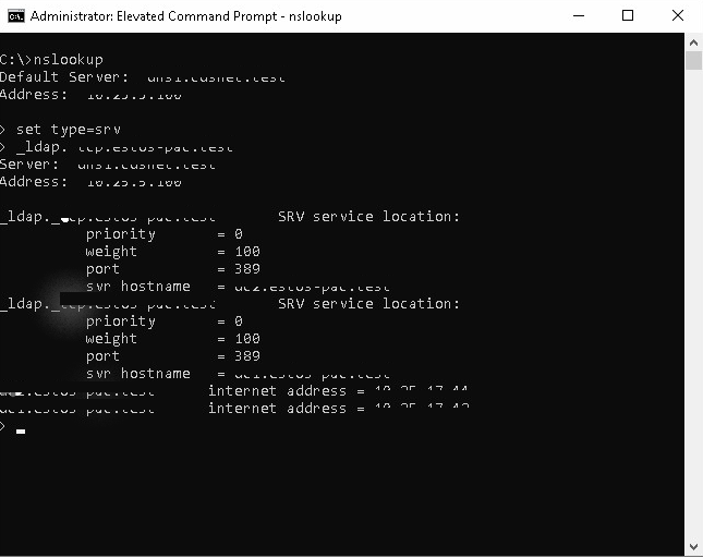 Beispiel Screenshot: nslookup - Non-Authoritative Answer to SRV-Record Lookup (hier via Conditional Forwarder)