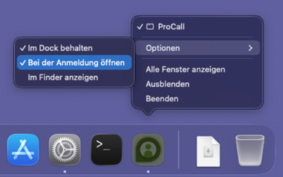 Obwohl diese Option vom Benutzer aktiviert wird, erfolgt beim Start des Apple macOS Betriebssystems oder einer Neuanmeldung der Benutzersitzung kein Autostart von ProCall Desktop for macOS.