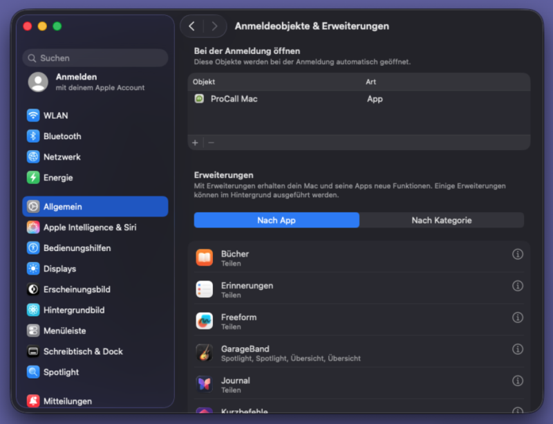 In den Apple macOS Systemeinstellungen wählen Sie den Konfigurationsabschnitt Allgemein und hier die Anmeldeobjekte & Erweiterungen. Fügen Sie nun der Objektliste unter Bei der Anmeldung öffnen die Anwendung ProCall Mac hinzu: