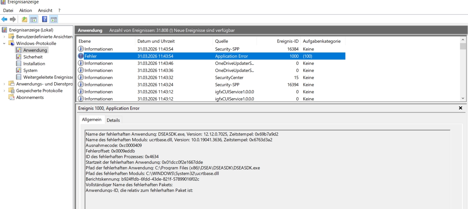 Wird die Meldung "Bitte installieren Sie zuerst 'EPOS DSEASDK.MSI'" trotz korrekt installierter EPOS Software angezeigt, prüfen Sie bitte in Windows Task-Manager, ob DSEASDK.exe gestartet ist. Falls nicht, versuchen Sie die Datei DSEASDK.exe (.\Program Files (x86)\DSEA\DSEASDK\DSEASDK.exe) manuell auszuführen. Wird die Datei nicht ausgeführt, überprüfen Sie die Windows Ereignisanzeige nach einem Absturz der DSEASDK.exe.