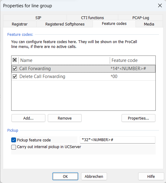 Example screenshot: UCServer administration – Telephony – Lines – Properties for line group – Feature codes – Pickup