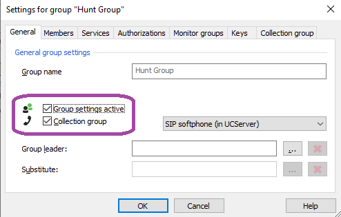 Beispiel Screenshot: Gruppen im UCServer - Allgemein - Allgemeine Gruppeneinstellungen - Gruppeneinstellungen aktiv - Sammelgruppe