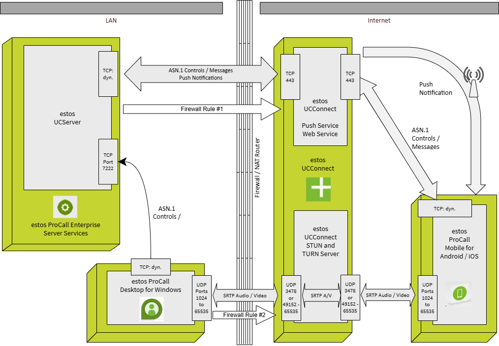 | 1 | Anbindung des ProCall Enterprise Servers an estos UCConnect für den Austausch der ASN.1-Messages (internes Kommunikationsprotokoll) und für die Push Notifications | OUT | <UCServer-Host>:any | *.ucconnect.de:443 | TCP | Das WebSocket-Protokoll muss unterstützt sein. |