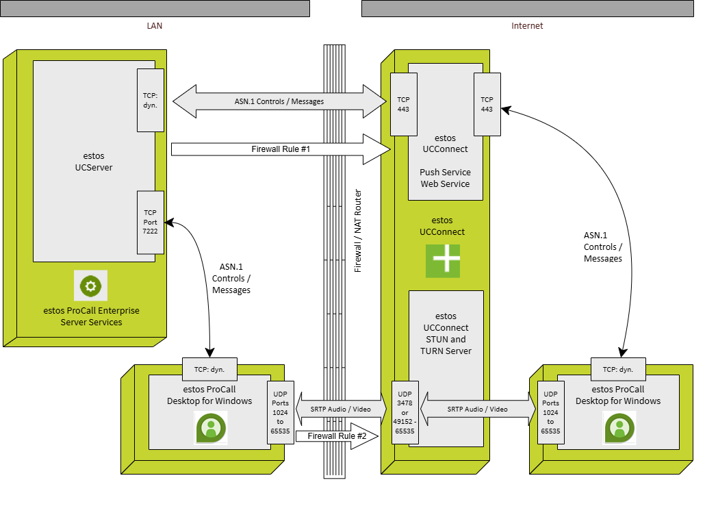 Schaubild/Topologie: UCServer Dienst - ProCall Desktop for Windows - UCConnect Dienste - ProCall Desktop for Windows VPN-less - SRTP Audio/Video via TURN: