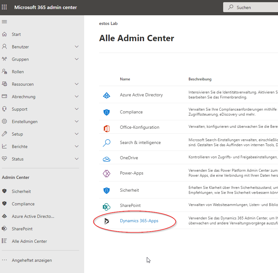 Beispiel Screenshot Microsoft 365 Admin Center - Dynamics 365 Apps