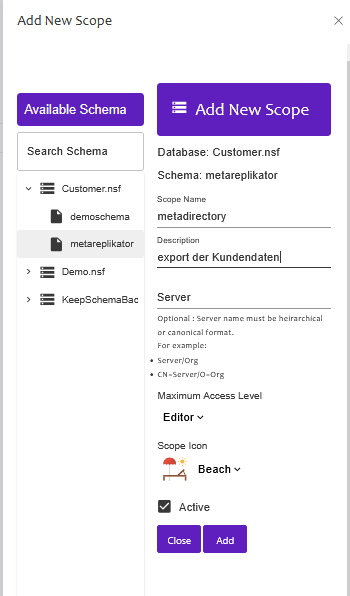 Beispiel Screenshot Scope Management HCL Domino REST API Databases Scope - Add Scope