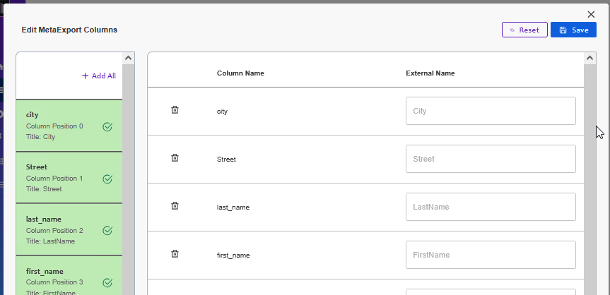 Example screenshot – Edit MetaExport Columns – Column Name – External Name – Field mapping
