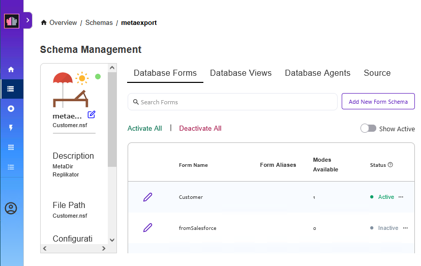 Example Screenshot Schema Management - Overview - Schemas - metaexport - Database Forms - Activate All