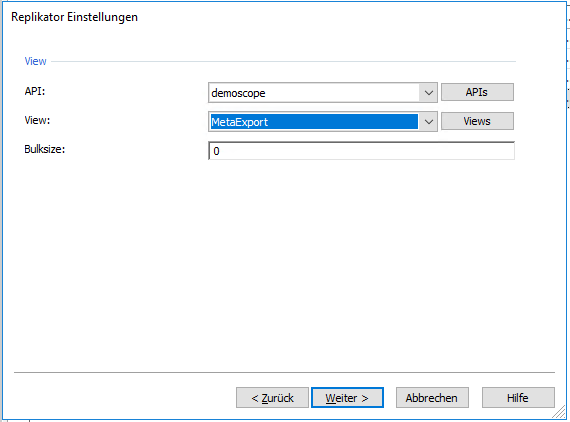 Example screenshot: MetaDirectory Administration – Replicator Settings – View via API, View and Bulksize