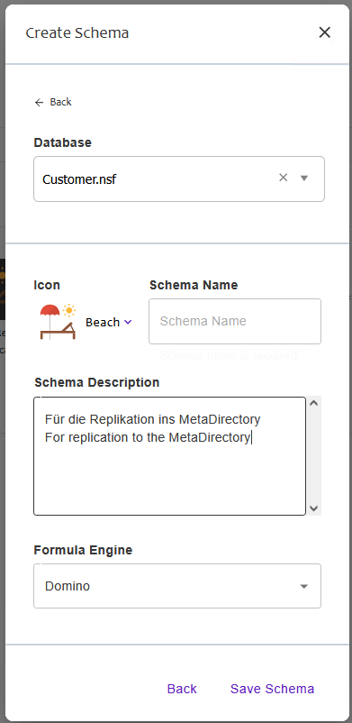 Select the database containing the data to be replicated and assign a "Schema Name".