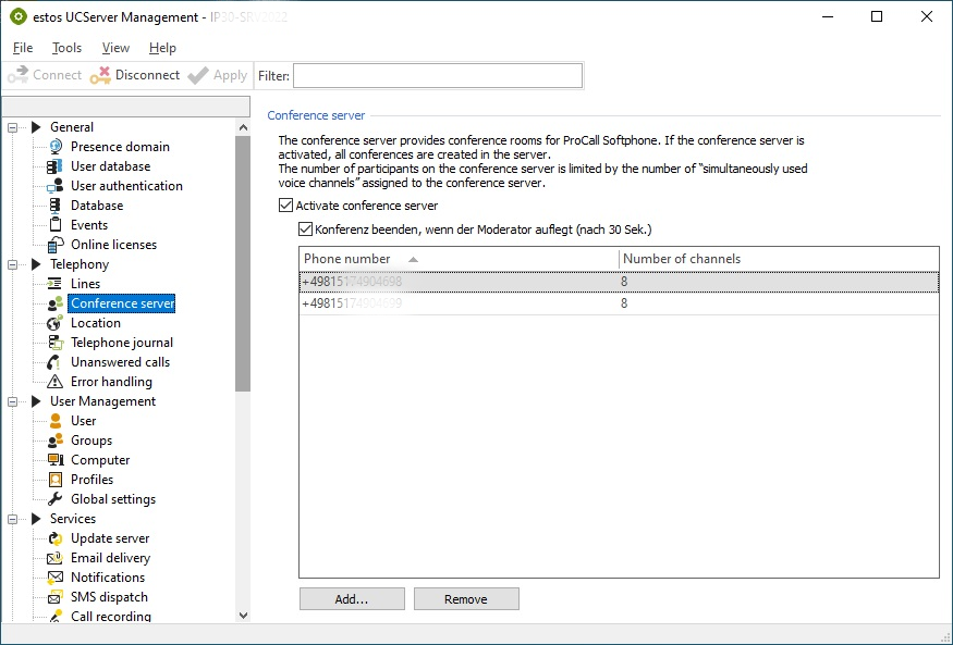 To set up the conference server, navigate to "Telephony - Conference Server" in the UCServer administration. Activate the conference server to set it up. At least one phone number must be assigned to the conference server.
