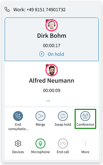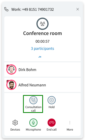 As before, you can start a conference from a consultation call in the call window: