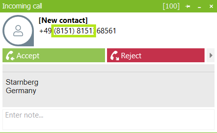 This changes the number resolution, and ProCall places its own area code before the number. This can happen for both incoming and outgoing calls.