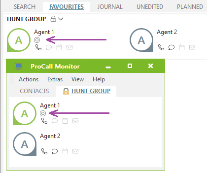 From ProCall Enterprise version 8.9 onwards (see Release Notes), members of the group can use the sign-in and sign-out functions. Other members of the team can view the sign-in status via the Favourites and Monitor views: