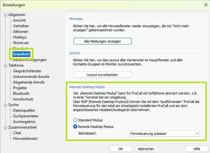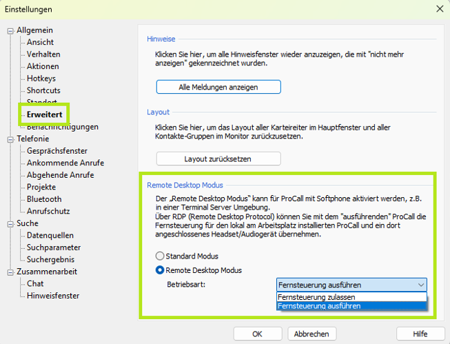 Example screenshot: ProCall Desktop for Windows - Settings - General - Advanced - Remote desktop mode - Run remote control mode