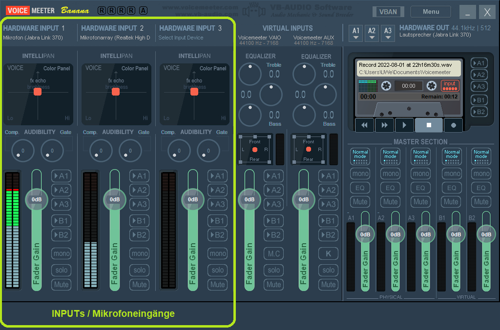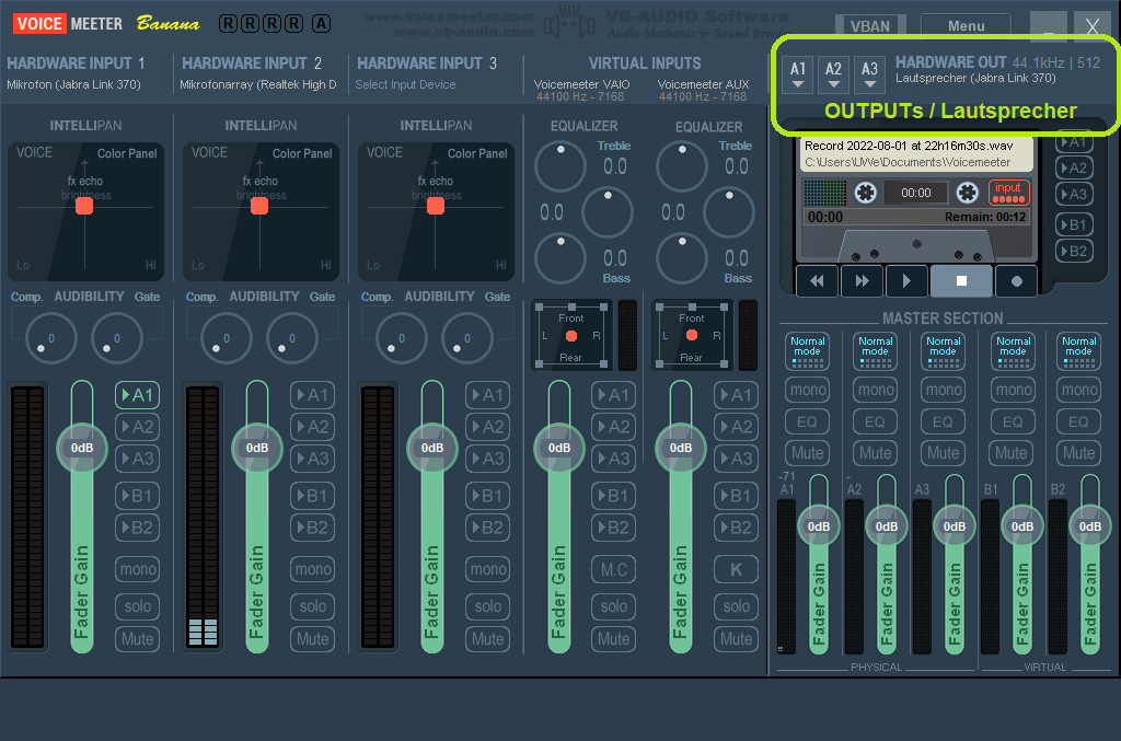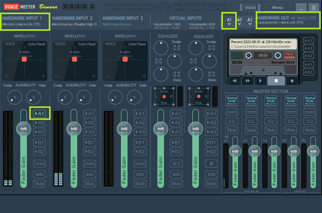 In this example, a microphone (here the microphone of a Jabra headset) is looped through to the earpiece of the Jabra headset via the VoiceMeeter Banana mixer.