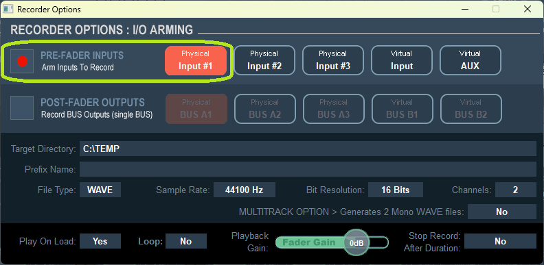 Example screenshot: VoiceMeeter Banana Recorder Options - PostFader Outputs - Fader Gain