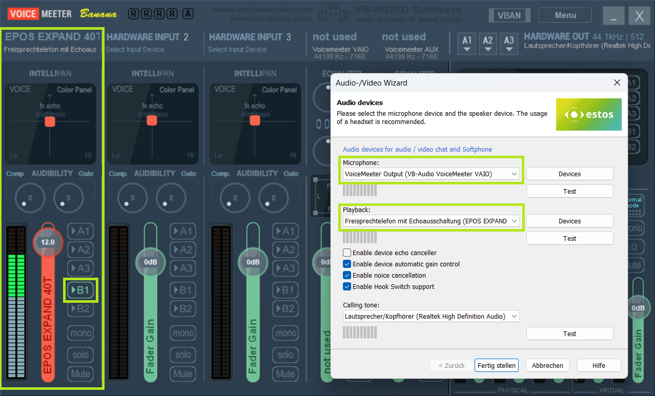 Example screenshot of Voice Meeter Banana, EPOS headset and ProCall Desktop for Windows audio/video wizard with audio device settings