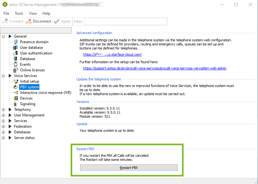 Example screenshot ProCall NEX Server Administration – Voice Services – PBX system – Restart PBX...